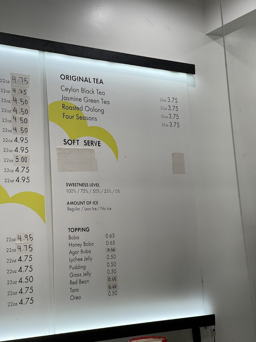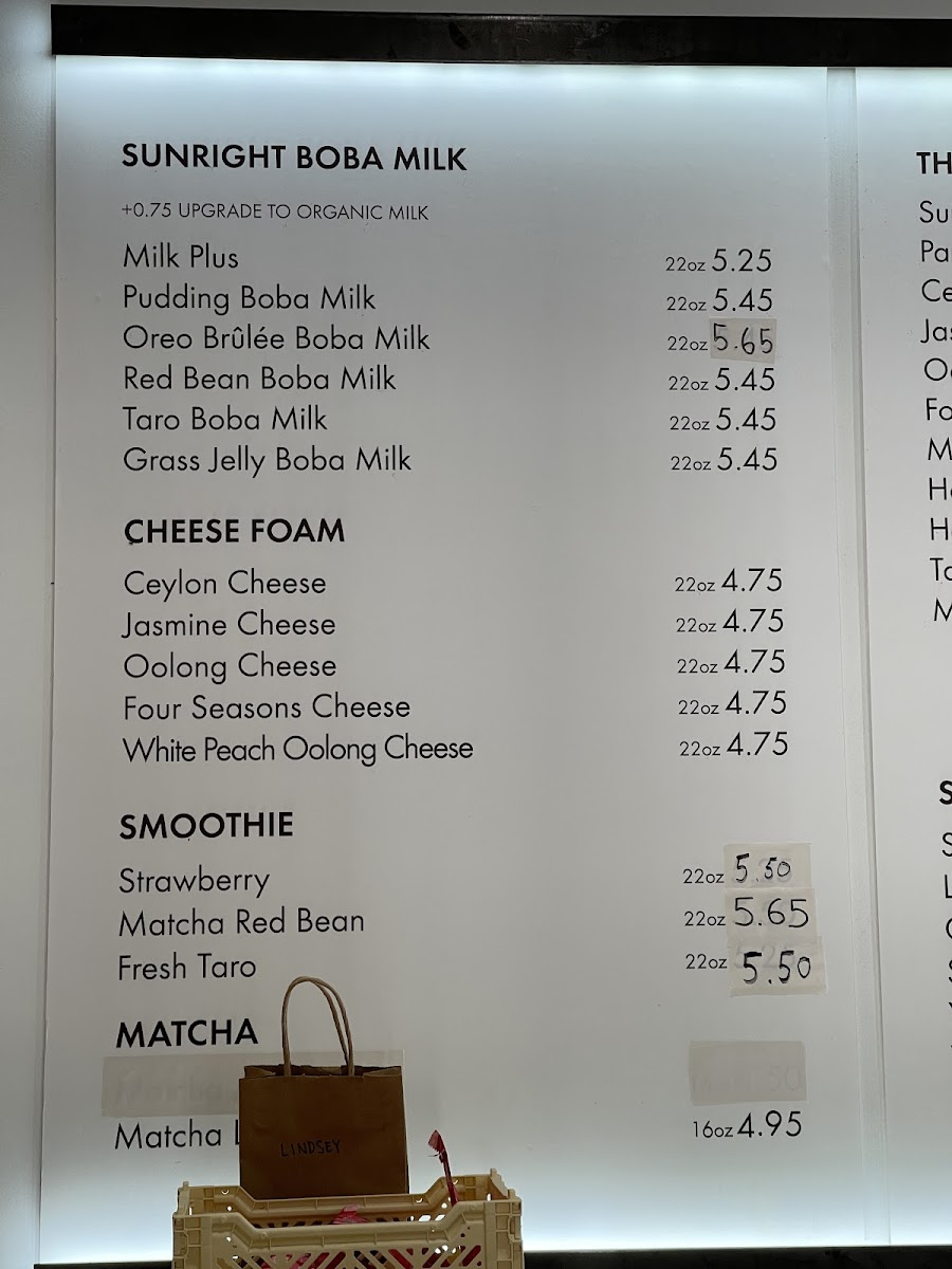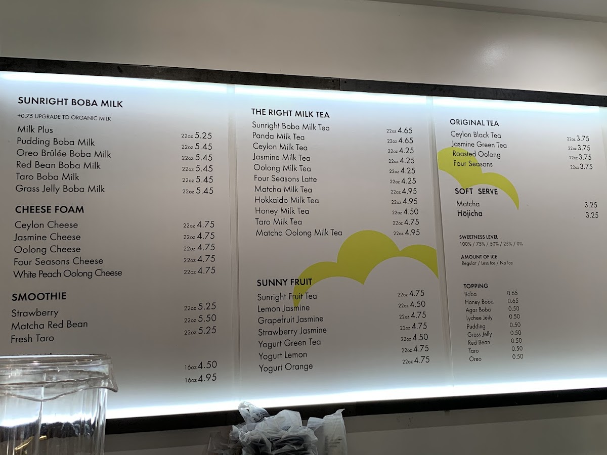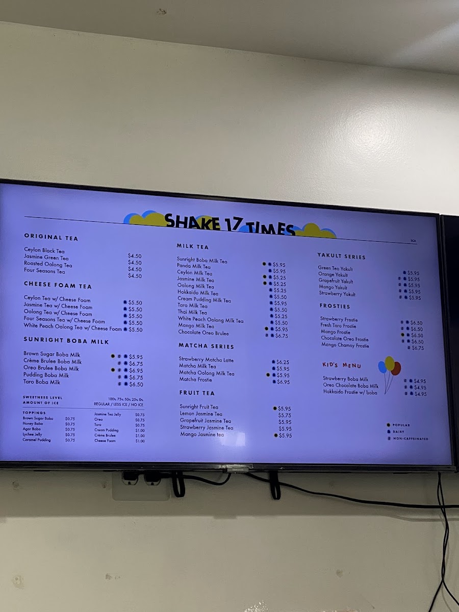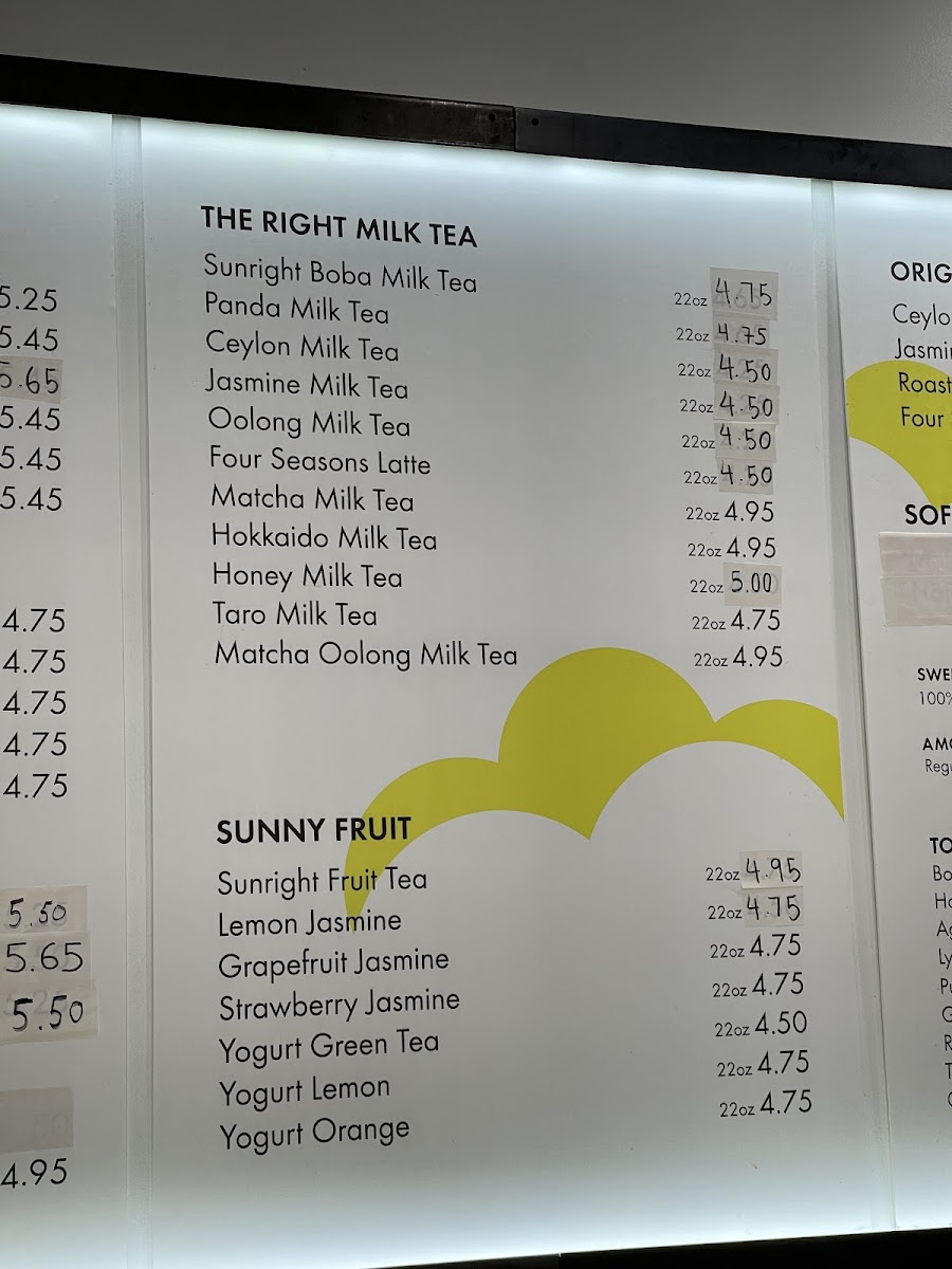 Sunright Tea Studio in Costa Mesa offers an extensive and diverse menu with something for every taste. Their limited release offerings, like the Lemon Yakult W/ Tea Jelly, are a unique twist on refreshing beverages. New releases include indulgent options such as the Dubai Chocolate Frostie and the smooth Matcha Latte W/ Pistachio Cheese Foam. For regulars, the customer favorites like Sunright Boba Milk Tea and Oreo Brulee Boba Milk are perennial hits. Their milk tea selection is also wide-ranging, featuring drinks like the Panda Milk Tea and Hokkaido Milk Tea. Fruit teas, including the refreshing Mango Jasmine Tea and Grapefruit Jasmine Tea, are perfect for those looking for a lighter, fruitier option. The Sunright Brown Sugar Boba Milk series is especially popular, with drinks like Brown Sugar Boba Milk and Creme Brulee Boba Milk standing out. For something more decadent, try their Frosties, such as the creamy Strawberry Frostie or the exotic Mango Chamoy Frostie. The matcha lovers are not left out, with treats like Matcha Milk Tea and the Strawberry Matcha Latte. Yakult series drinks, such as the tangy Mango Yakult, offer a delightful balance of tartness and sweetness. The cheese foam offerings, like the Jasmine Cheese, provide a savory contrast to the sweetness of the teas. For those who prefer hot drinks, the menu includes a selection of hot milk teas and coffees, including the Hot Signature Coffee and Hot Taro Boba Milk. Sunright also caters to younger guests with a kid's menu, featuring drinks like the Kid's Strawberry Boba Milk. Whether you're in the mood for a frosty treat, a comforting hot drink, or something in between, Sunright Tea Studio has a wide range of options to satisfy any craving.